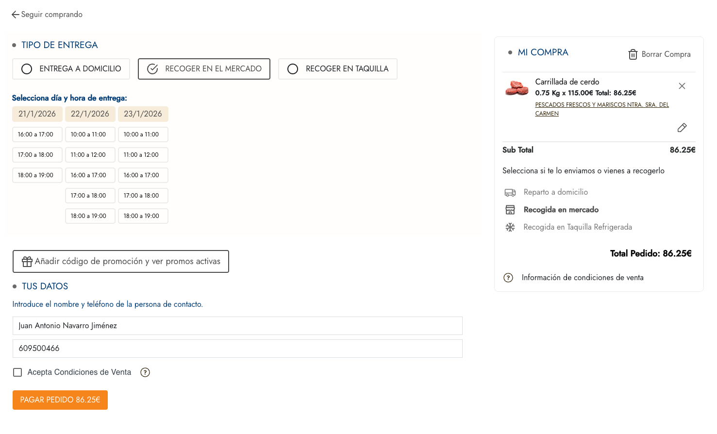 Cliente puede recibir su mercancía o ir al mercado a recogerla. Otra opción es la de poder recoger en taquillas refrigeradas.